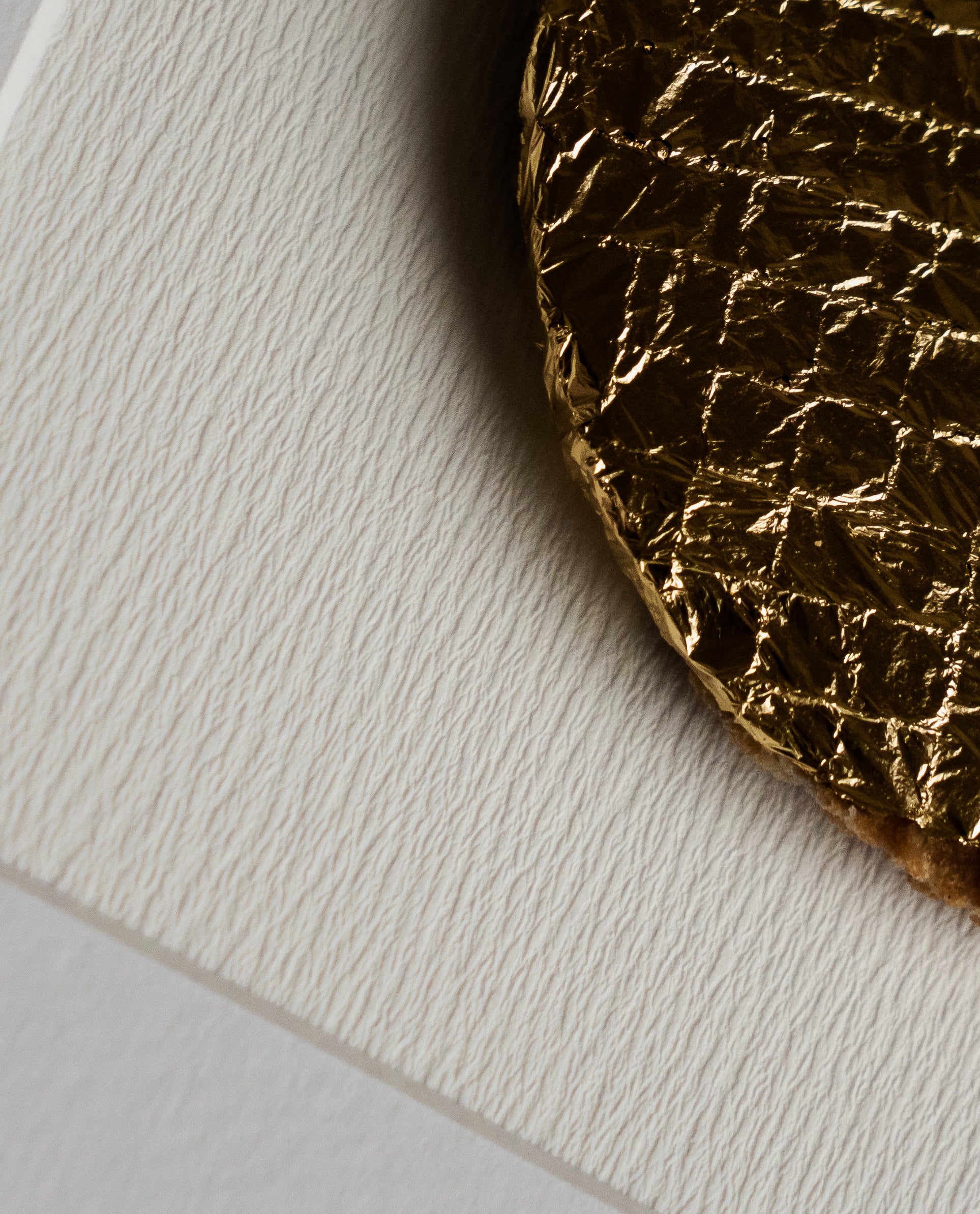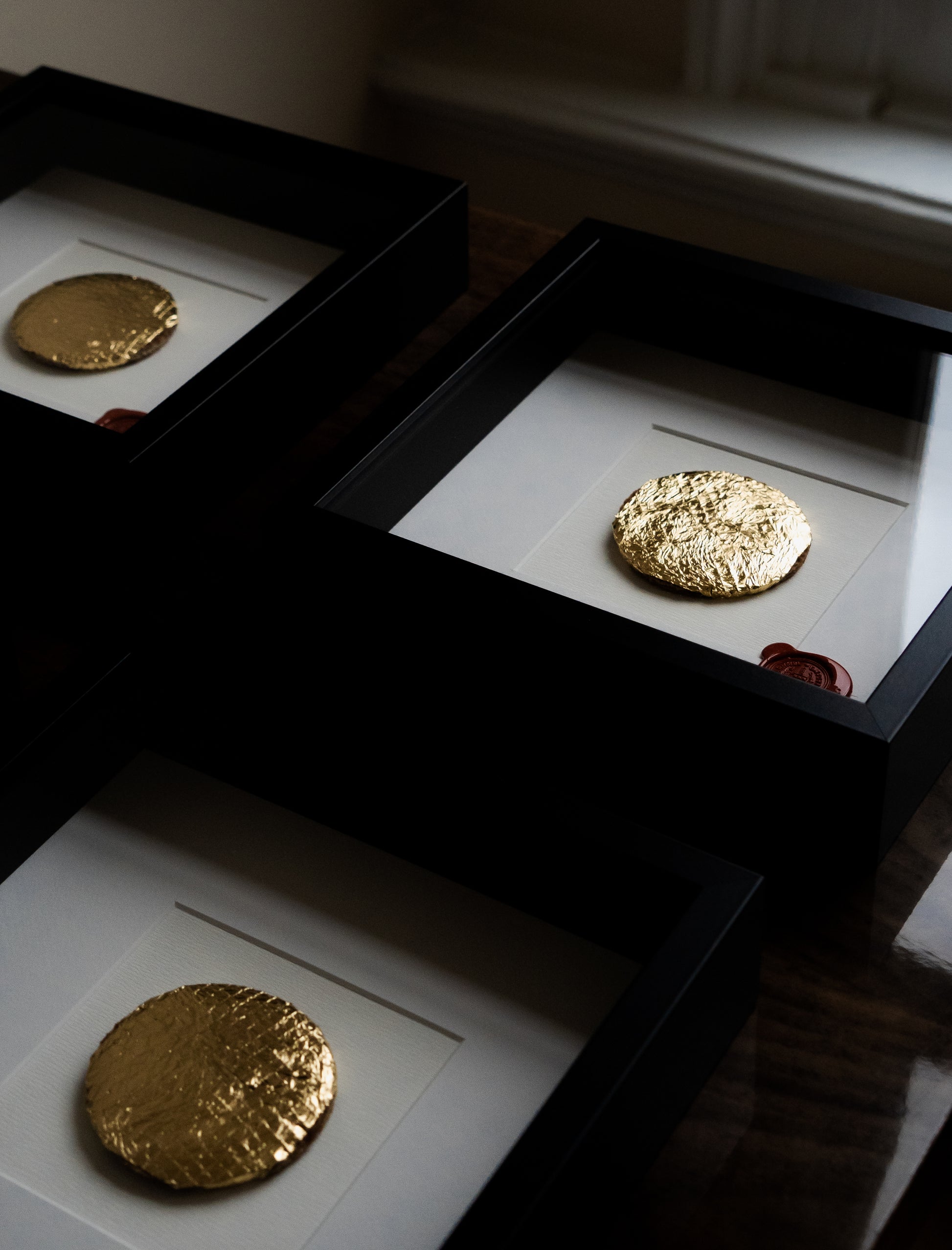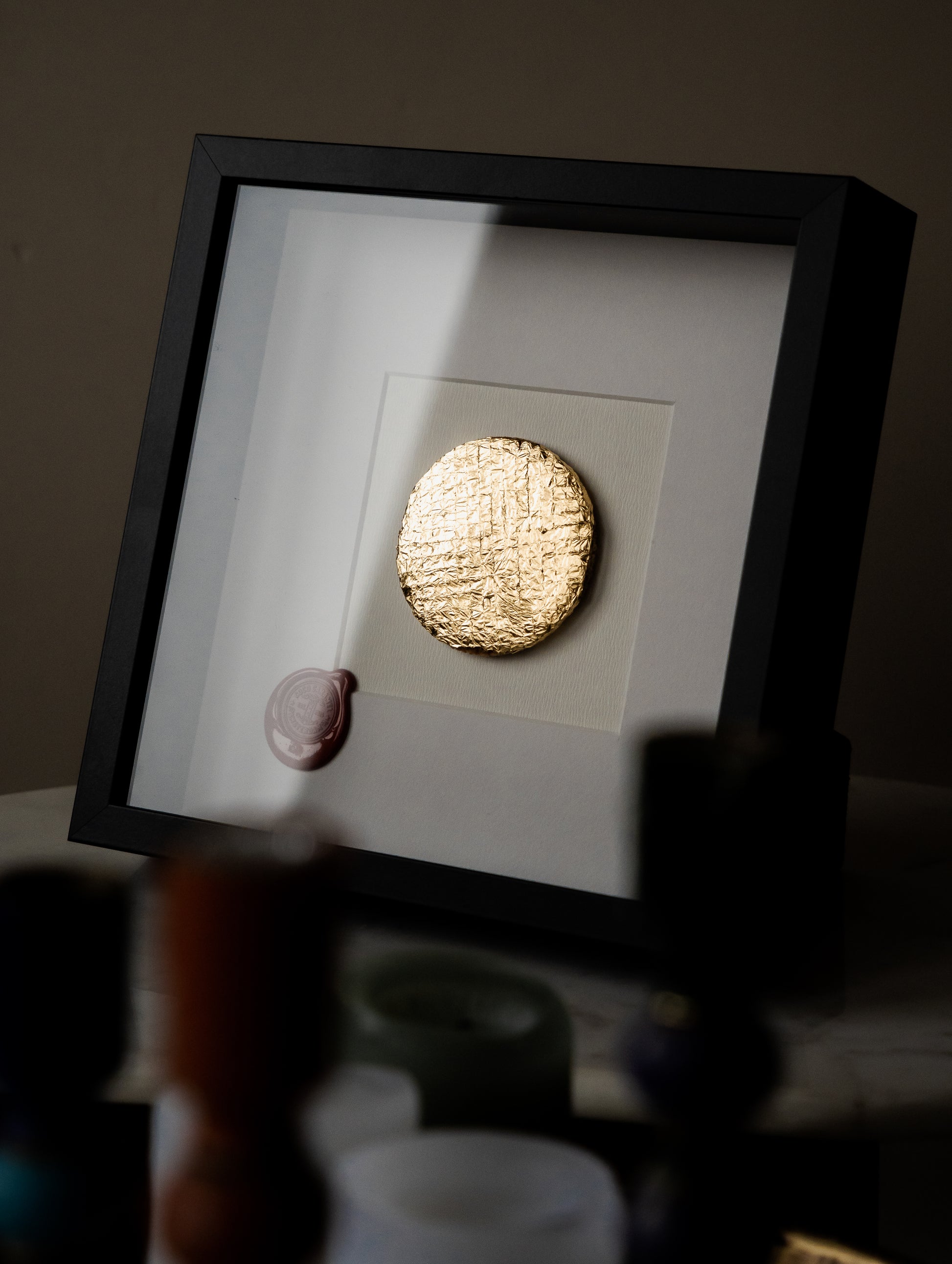 A framed art object featuring an authentic Dutch caramel waffle, hand-gilded with 23-karat gold leaf.